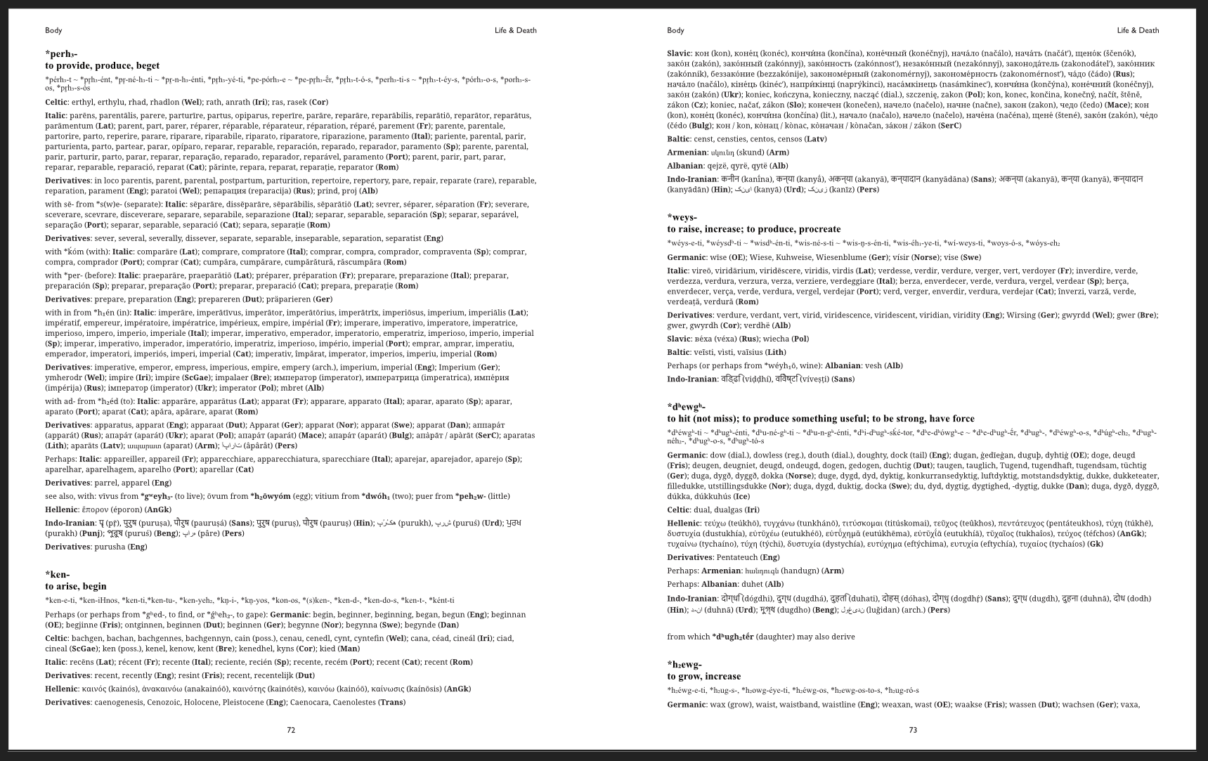 The dictionary consists of two parts. The first part contains the pages for each Proto-Indo-European (PIE) word (the root word, spoken thousands of years ago), showing cognates in the chosen languages plus various descendants and derivatives. These pages are arranged thematically. This part allows you to browse or study. Search is enabled by the second part to the dictionary, which contains a separate index for each language, telling you to which PIE root the word belongs.